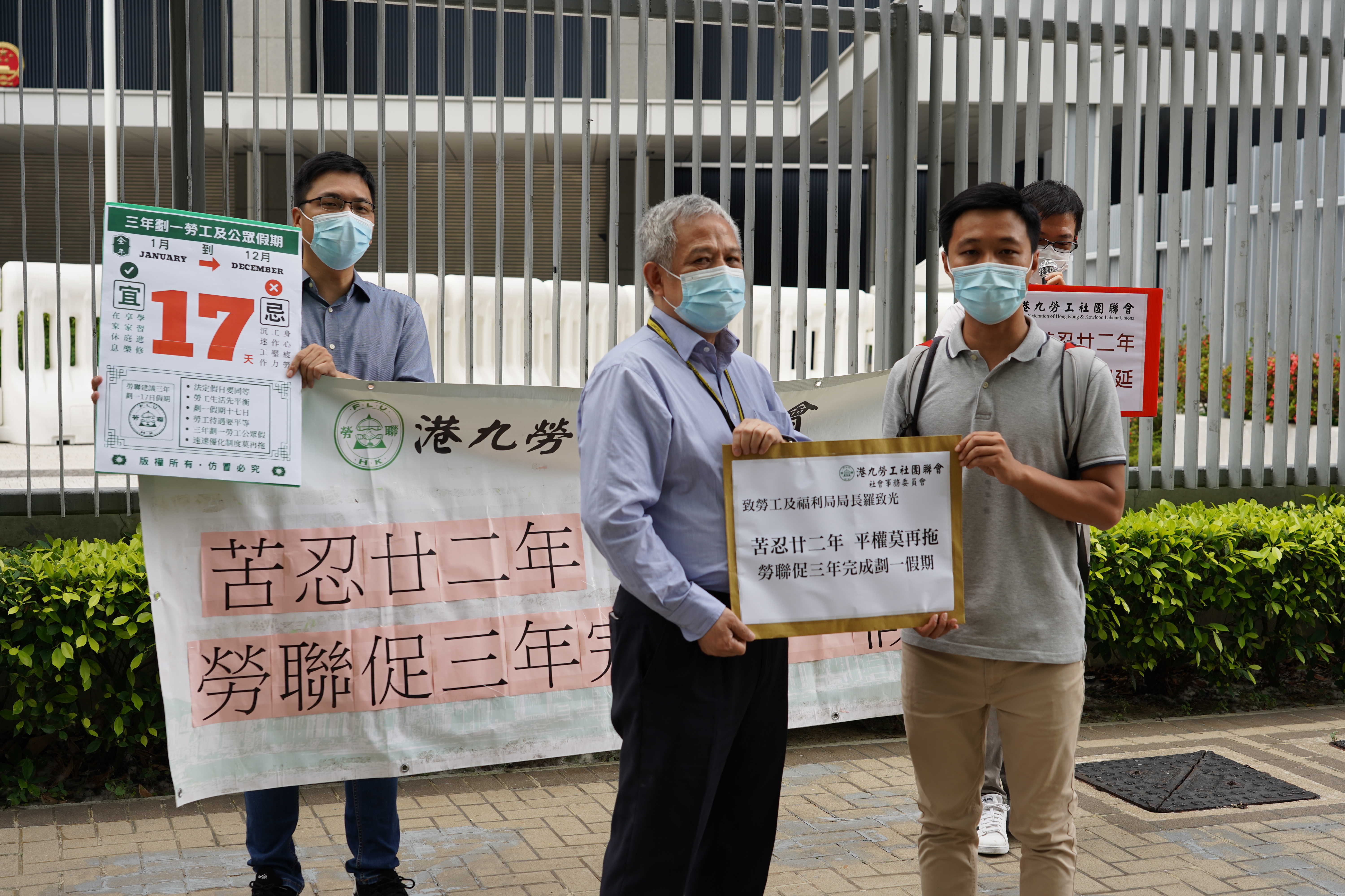 港九勞工社團聯會主席林振昇、副主席儲漢松,聯同多名工會代表,今日(19日)到政府總部請願,向勞工及福利局的代表遞交請願信,要求政府優化草案,3年內完成勞工假劃一至17天,並促請政府尊重立法會於2019年通過勞聯立法會議員潘兆平提出的「檢討假期政策」議案。