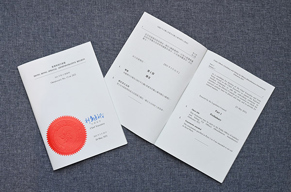 行政長官林鄭月娥今日(20日)根據基本法第48條第3款簽署經立法會通過的《2021年公職(參選及任職)(雜項修訂)條例》,條例明日(21日)刊憲公布,之後正式生效。林鄭月娥說:「要全面準確落實『一國兩制』,我們必須依照憲法和基本法辦事。條例完善了基本法規定的宣誓安排和有效處理公職人員宣誓就職後因從事違反誓言的行為而須承擔的法律後果,有助『一國兩制』貫徹實施。」