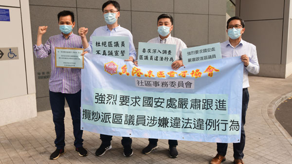 香港東區各界協會21日到灣仔警察總部請願,要求國安處嚴肅跟進東區「攬炒派」區議員涉嫌違法違例事宜。記者崔俊良攝