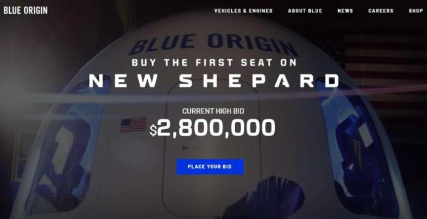 據外媒報道,美國亞馬遜公司創始人貝索斯旗下的太空探索公司「藍源」研製的載人飛船,計劃在今夏升空。該飛船的首飛座位正在進行網上競標,截至目前,座位的最高出價已達280萬美元。