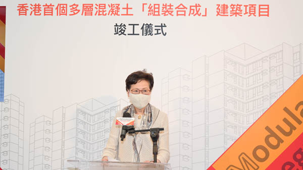 行政長官林鄭月娥今日(21日)主持將軍澳百勝角消防處已婚人員宿舍竣工儀式,該項目由3726個「組裝合成」元件組成,是香港首個採用混凝土「組裝合成」建築法興建之多層建築項目。林鄭月娥預計在今年至明年,有4個紀律部隊宿舍陸續完工入伙,為各紀律部隊人員提供2300個單位。