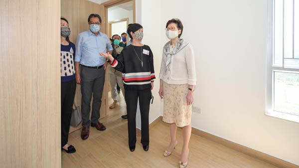 圖為林鄭月娥在發展局局長黃偉綸與建築署署長何永賢陪同下參觀以「組裝合成」建築法興建的宿舍單位。