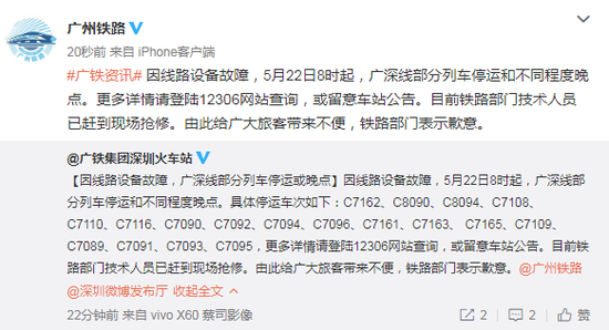 據中國鐵路廣州局集團有限公司官方微博:因線路設備故障,5月22日8時起,廣深線部分列車停運和不同程度晚點。更多詳情請登陸12306網站查詢,或留意車站公告。目前鐵路部門技術人員已趕到現場搶修。由此給廣大旅客带來不便,鐵路部門表示歉意。