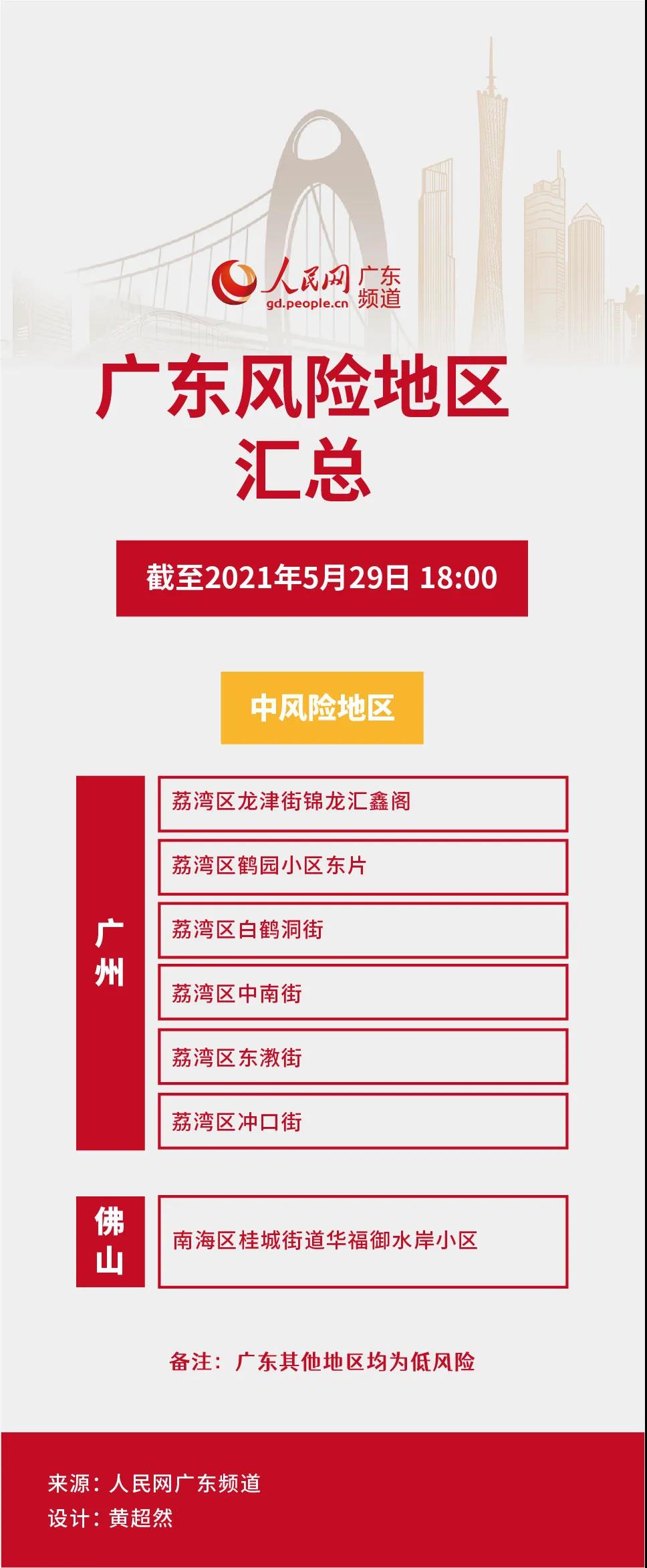 截至目前,廣東省共有7個中風險地區,除了上述佛山一地,其餘6個均在廣州,分別是廣州市荔灣區龍津街錦龍匯鑫閣、鶴園小區東片、白鶴洞街、中南街、東漖街、沖口街。