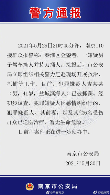 5月30日淩晨3時許,江蘇省公安廳發布南京一男子駕車撞人並持刀捅人的詳情。