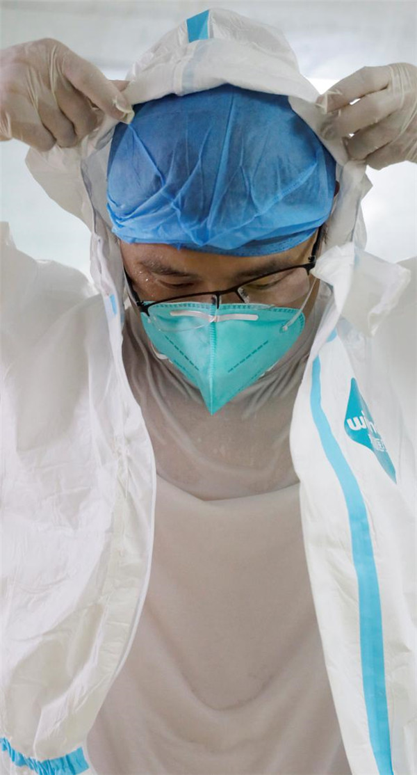 醫護人員完成一天的核酸檢測任務,正在脫防護服。