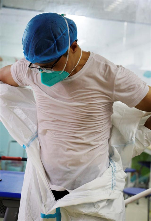 炎熱天氣下,醫護人員身穿封閉的防護服,手套里全是汗水,最後只能用剪刀剪開才能脫下來。