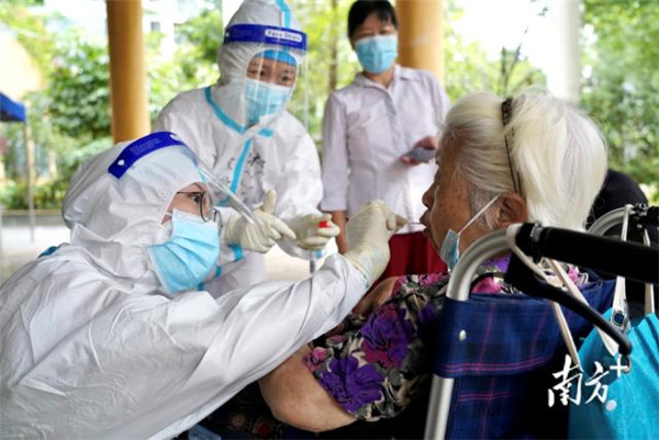 福田海馨苑核酸採樣點,醫護人員正在為老人家核酸檢測採樣。