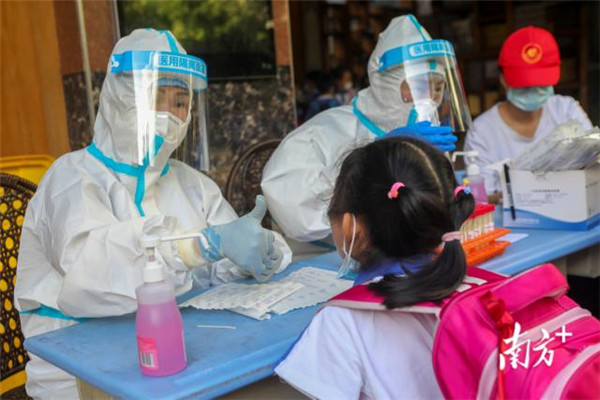 深圳市龍崗區四聯小學核酸採樣點,醫護人員給小朋友的勇敢點讚。