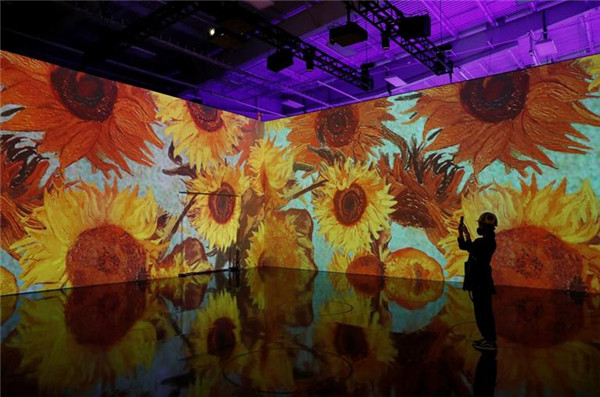 當地時間5月26日,在美國紐約曼哈頓舉行的「梵高-身臨其境」媒體預覽會上,人們欣賞荷蘭藝術家梵高作品的大型3D投影。