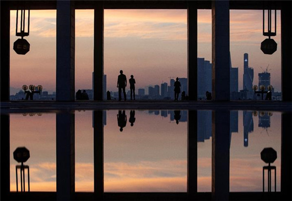 當地時間5月27日,在俄羅斯莫斯科,人們在觀看日落,他們的影子倒映在水中。