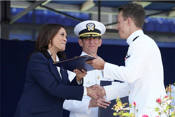 當地時間 5月28日,在美國馬里蘭州,美國海軍學院的畢業生們在領取畢業證書後拋出帽子,美國副總統賀錦麗出席了當天的典禮。