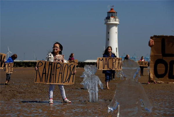 當地時間5月31日,在英國的布萊頓海灘,藝術組織「你眼中的沙」創作一尊尊冰雕小人,以強調 2021年聯合國氣候變化大會的重要性,該會議將於今年 11月在英國格拉斯哥舉行。