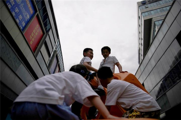 當地時間6月1日,在中國上海,孩子們在一個購物廣場內的遊樂場快樂地玩耍。