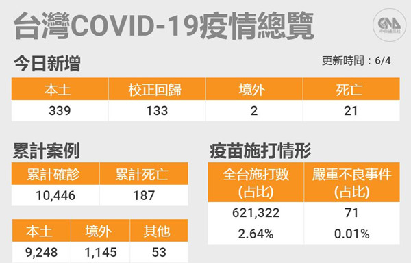 台灣流行疫情指揮中心4日公布,台灣新增472例本土新冠肺炎確診病例,含339例本土病例及133例所謂「校正回歸」本土病例,已連續21天本土確診超百例,另有2例境外輸入病例。