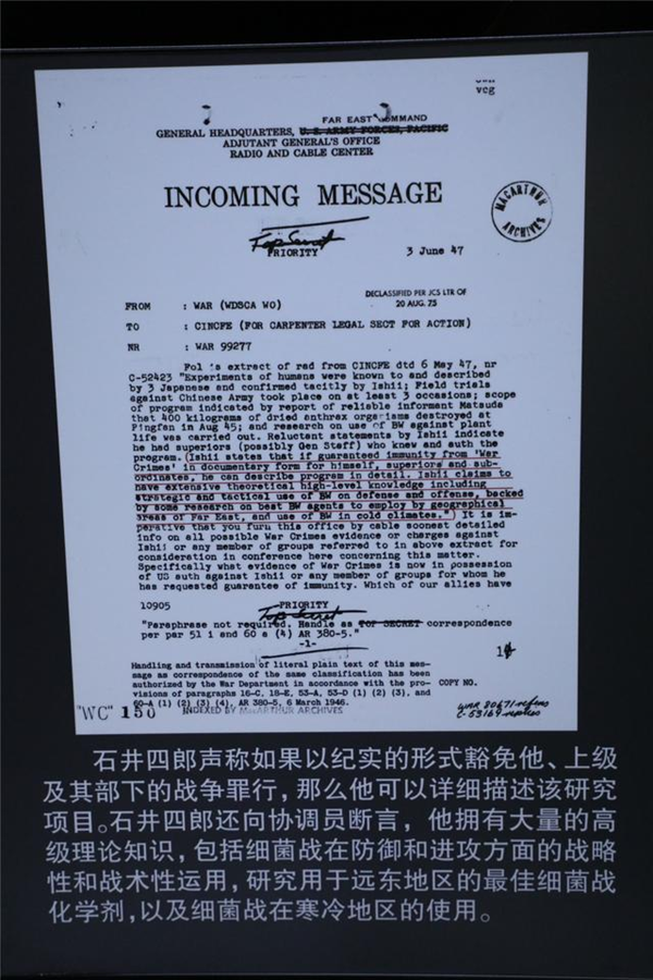 石井四郎等人源源不斷地向美方提供各種數據和資料,包括石井四郎組織撰寫的細菌武器人體試驗報告、細菌武器對農作物和牲畜的摧毀效果研究報告,還有石井四郎親自撰寫的20年來對細菌戰的全面研究總結。此外還有8000多張有關用細菌武器作活人試驗和活人解剖的病理學標本和幻燈片等。