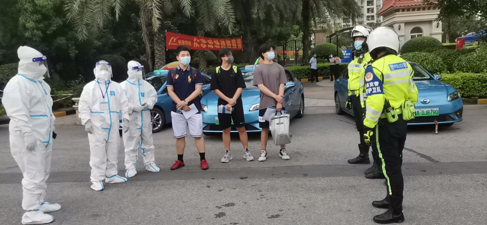 廣州高考首日轉運考生共819人,圖為考生在抗疫一線工作者的保障下到達考點。(受訪者 供圖)