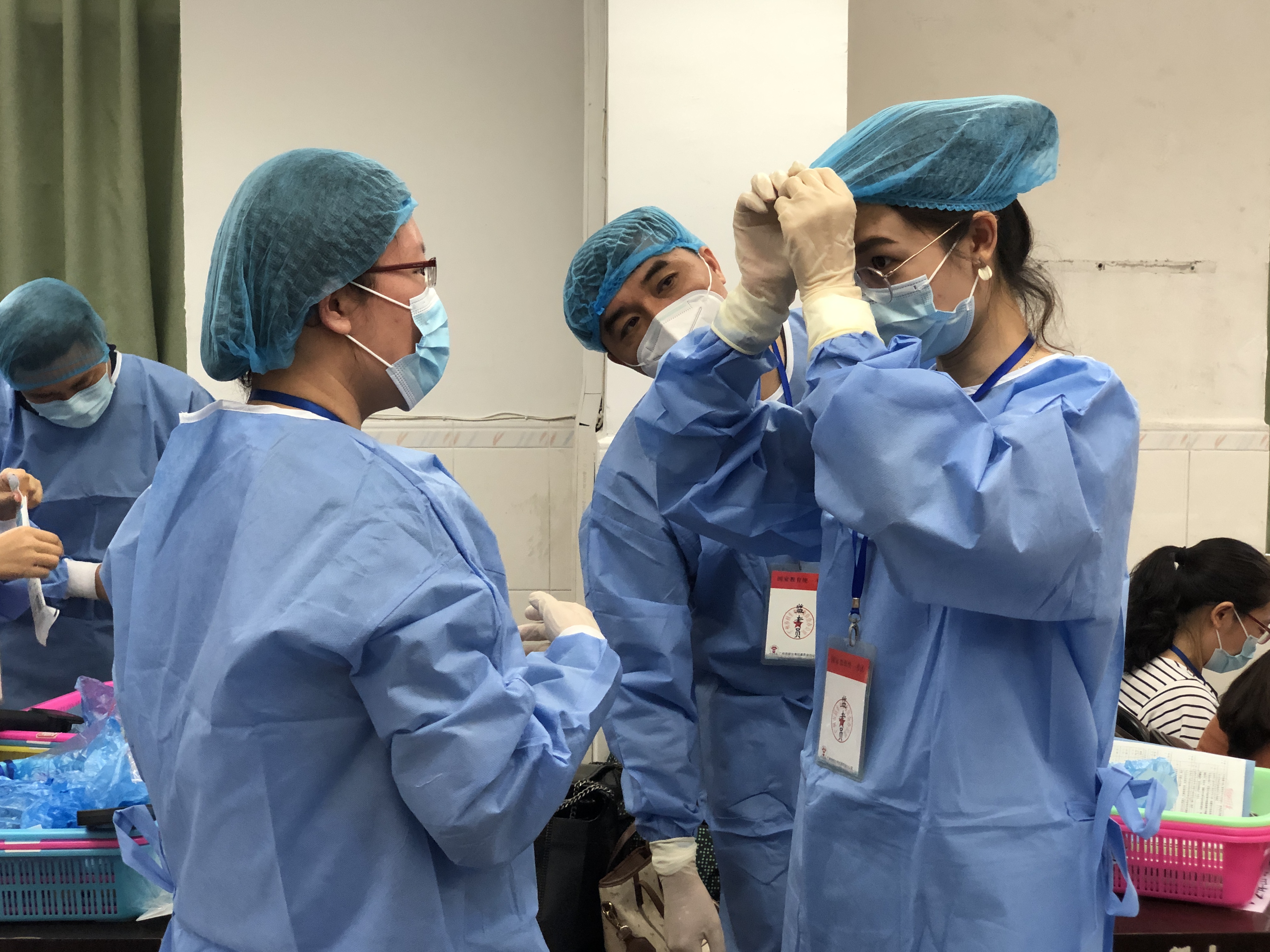 廣州市育才中序考點的隔離考室的監考老師換上防護服。(廣州市教育局 供圖)