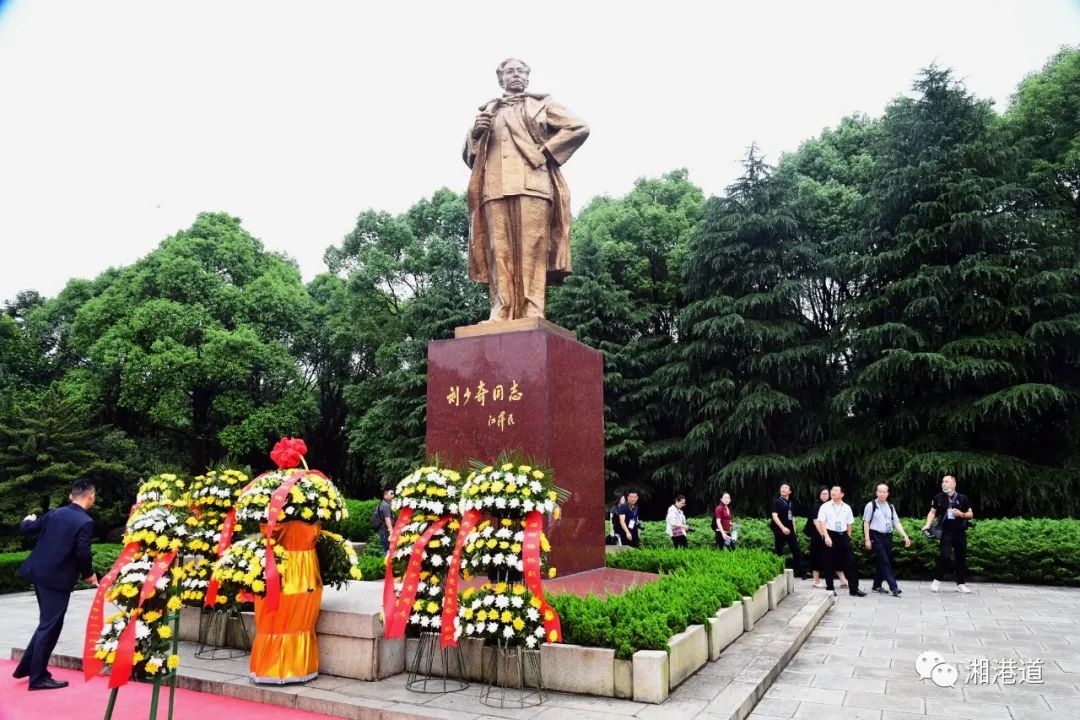 採訪團一行由從景區側門出發,拾級而上先後前往劉少奇故里銅像廣場、劉少奇紀念館及劉少奇故居等地。劉少奇故里銅像廣場佔地面積8000多平方米,道路兩旁青松傲立、幽遠深遂,劉少奇銅像座西北朝東南,威嚴矗立在廣場正中央。在廣場莊嚴肅穆的氛圍中,採訪團一行向劉少奇敬獻花籃,寄託對劉少奇的深切哀思。據悉,劉少奇銅像是1988年在其誕辰90周年時落成的,銅像由時任國家主席楊尚昆親自揭幕。
