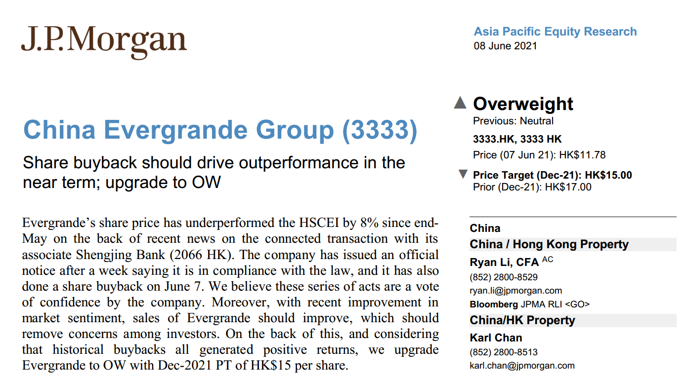 發聲明澄清不實傳聞後,恒大獲得國際投行力挺。6月8日,摩根大通發布研報稱,恒大發布聲明、回購股份等一系列動作極大提振了市場信心,同時公司銷售持續強勁也消除了市場的擔憂,上調評級至「增持」,目標價15港元。