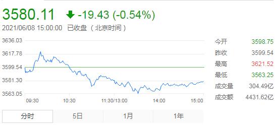 截至收盤,滬指跌0.54%,報3580.09點,深成指跌0.98%,報14716.98點,創業板指跌0.61%,報3208.57點。滬深兩市成交額9849.3億元;北向資金實際淨流入3.01億元。兩市96股漲停,30股跌停(含ST)。