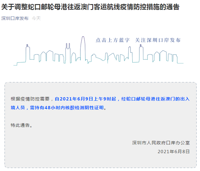 通告稱:根據疫情防控需要,自2021年6月9日上午9時起,經蛇口郵輪母港往返澳門的出入境人員,需持有48小時內核酸檢測陰性證明。