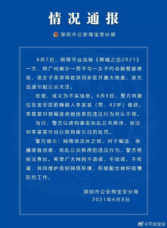 據@平安寶安 情況通報:6月7日,網絡平台流轉《傾城之戀2021》一文,稱廣州南沙一男子與一女子約會就餐被感染,該女子來深導致深圳多區開展大排查,該文迅速引起公眾關注。經查,該文為不實信息。6月8日,警方將居住在寶安區的嫌疑人李某某(男,42歲)查獲。李某某對其編造虛假信息的違法行為供認不諱。當日,警方以虛構事實擾亂公共秩序,依法對李某某作出行政拘留五日的處罰。
