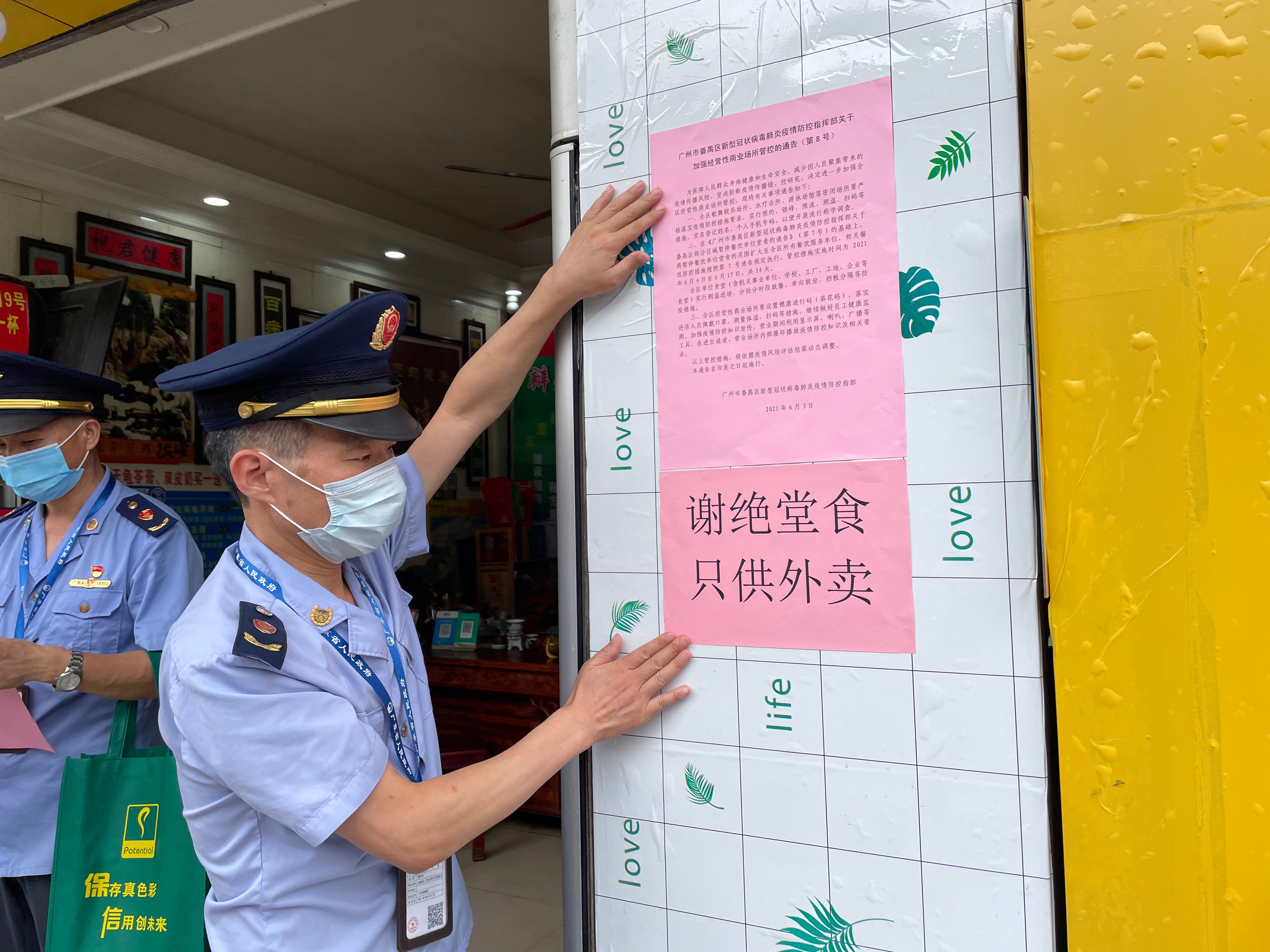 6月8日,廣州番禺區市場監管局發現番禺大石街某餐飲店開放小廳供客人「飲茶」,迅速組建專項小組趕赴現場。執法人員在涉事單位核查發現,該店雖已在門口顯著位置張貼「禁止堂食」告示,但在其2樓的2個房間內,分別設置了多張餐桌,容易出現人群聚集的情況,違反疫情防控相關規定。執法人員當即責令該店馬上停業整頓。