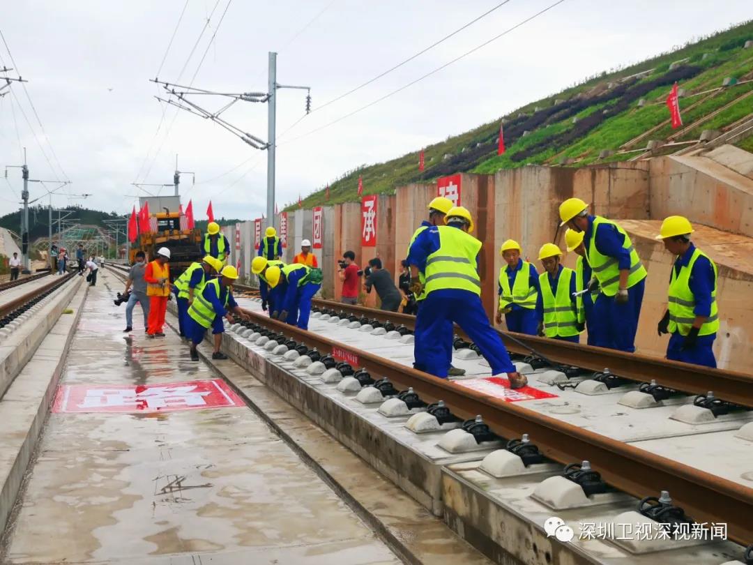 6月12日上午,隨着最後一節500米長軌鋪設完成,贛(州)深(圳)高鐵廣東段與江西段成功接軌,標誌着贛深高鐵全線正線軌道鋪設完成,為年底順利通車打下堅實基礎。