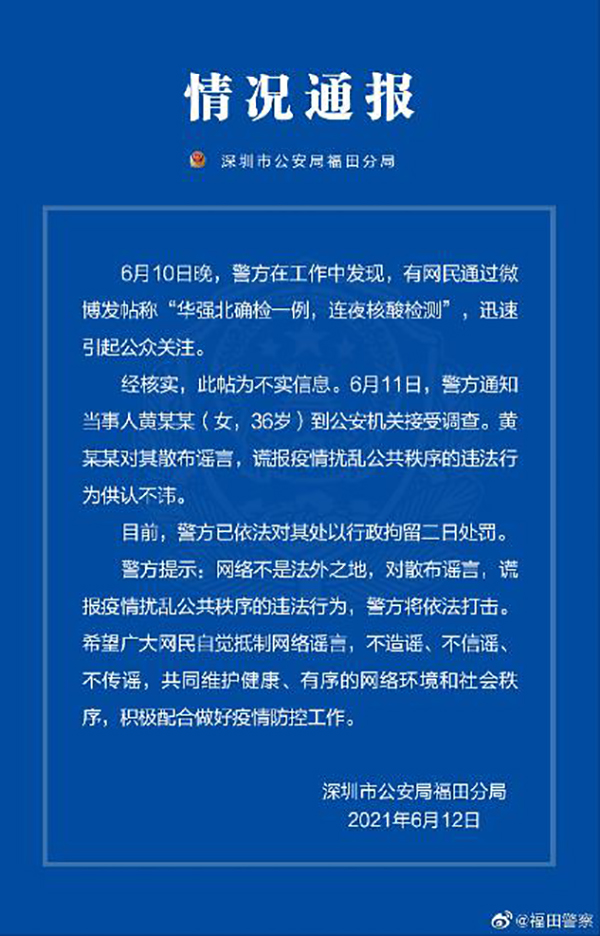 據深圳公安福田分局官方微博6月12日通報,6月10日晚,警方在工作中發現,有網民通過微博發帖稱「華強北確檢一例,連夜核酸檢測」,迅速引起公眾關注。經核實,此帖為不實信息。6月11日,警方通知當事人黃某某(女,36歲)到公安機關接受調查。黃某某對其散布謠言,謊報疫情擾亂公共秩序的違法行為供認不諱。目前,警方已依法對其處以行政拘留二日處罰。