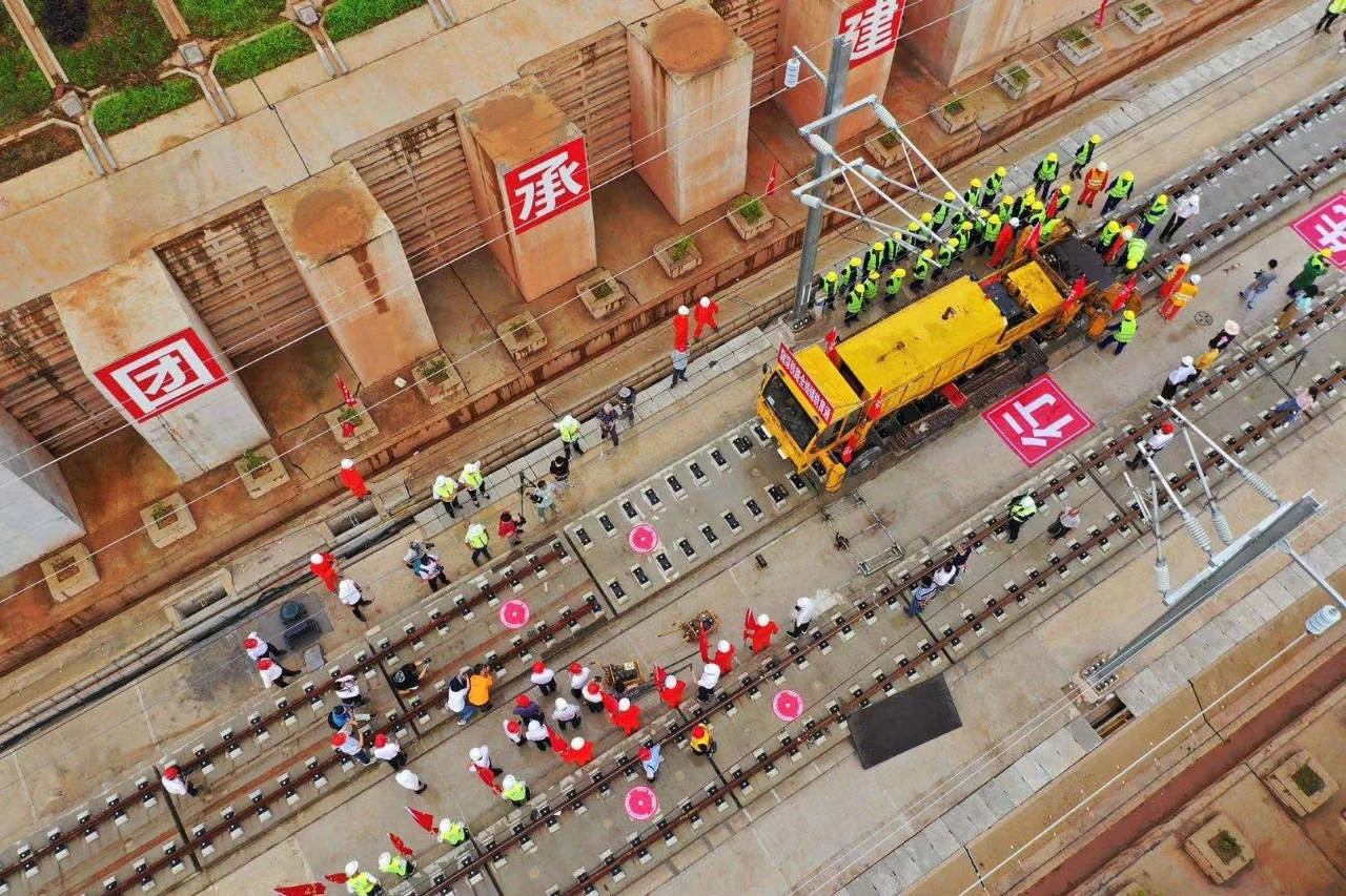 為確保贛深高鐵廣東段順利鋪軌,在深圳工程建設指揮部的精心籌劃下,中鐵四局贛深鐵路5標工程指揮部投入4組聯合研發的鐵路有砟、無砟軌道鋪設一體式鋪軌機組,實現有砟和無砟牽引模式的自由切換,方便、快捷地完成區間線路和站內線路相結合的鋪軌作業,全面提高鋪軌作業效率,確保施工質量與節點工期。