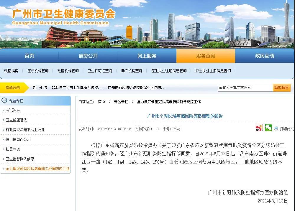 據廣州市衛健委消息,根據廣東省新冠肺炎防控指揮辦《關於印發廣東省應對新型冠狀病毒肺炎疫情分區分級防控工作指引的通知》,經廣州市新冠肺炎防控指揮部同意,自2021年6月13日起,廣州市南沙區珠江街道珠江西一路(142、144、146、148、150號)由低風險地區調整為中風險地區。其他地區風險等級不變。