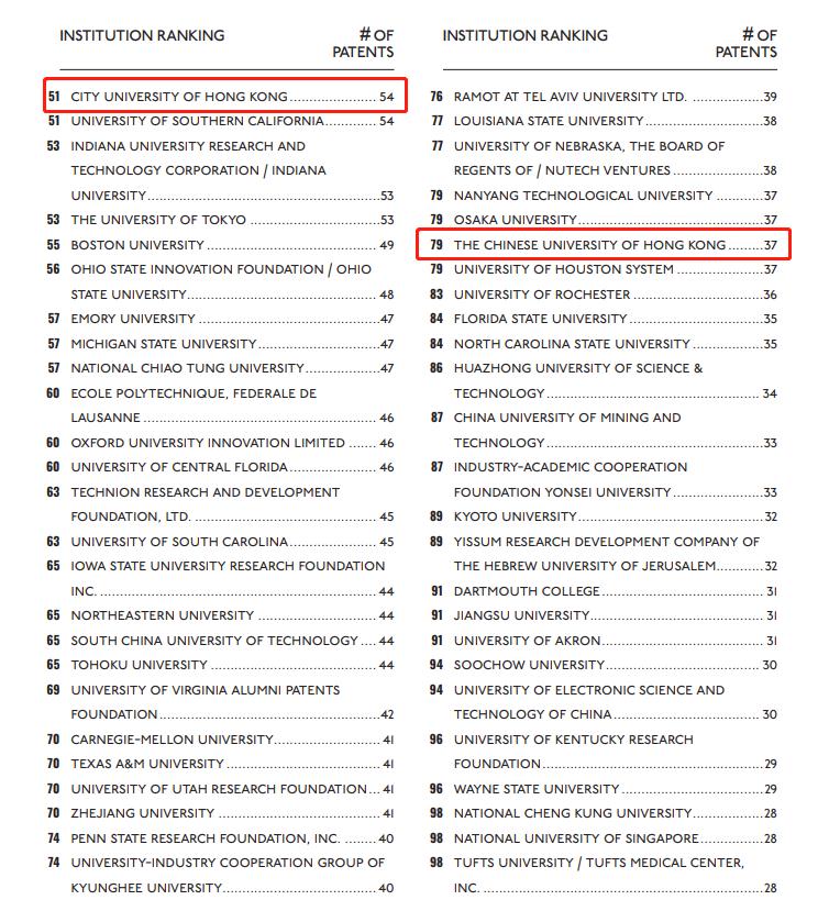 美國發明家學會(NAI)和知識產權持有者協會(IPO)於6月15日發表「2020年授予美國實用專利全球百強大學排行榜」報告,本港兩間大學入圍,分別為排名第51位的香港城市大學,以及排名第79位的香港中文大學。該報告使用了從美國專利及商標局 (USPTO) 所獲得的數據,凸顯專利在大學研究和創新中發揮的重要作用。