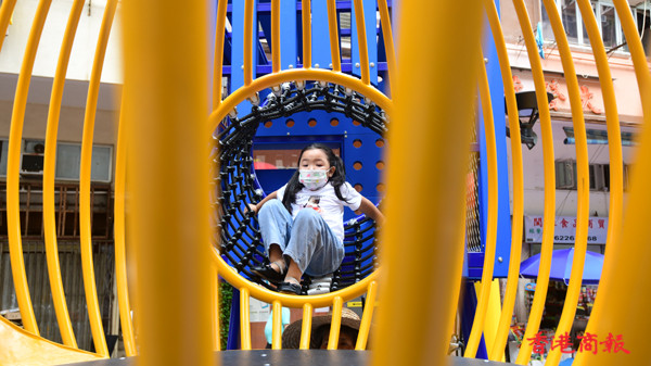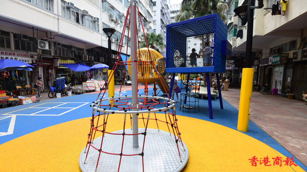 遊樂場內增設了長者健體設施,另有多款適合三至五歲小童遊玩的共融兒童遊樂設施,如高低不平的小斜坡、小山洞,令人感覺本是平平無奇的公園,瞬間變成開心小樂園。遊樂場設有三個區域,又有跳飛機、車軚韆鞦、滑梯、小型氹氹轉繩網等,另設水磨石座位,一改過往舊貌,確是老少咸宜的休憩地。(崔俊良攝)