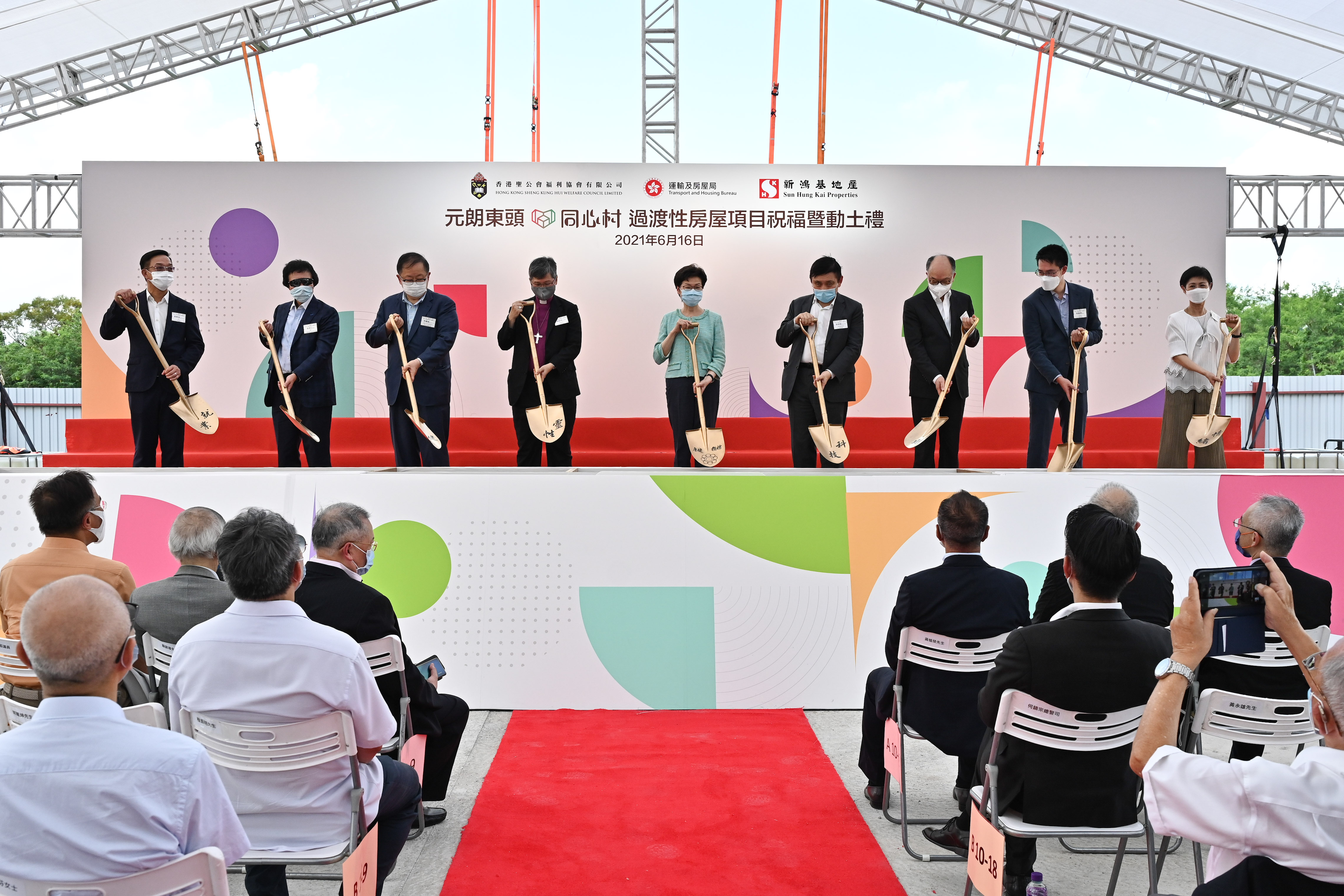 行政長官林鄭月娥今日(六月十六日)下午出席元朗東頭「同心村」過渡性房屋項目祝福暨動土禮。圖示(左起)新界鄉議局主席劉業強、新鴻基地產郭氏基金董事郭炳江、香港聖公會福利協會董事會暨執行委員會主席李國棟醫生、香港聖公會教省主教長陳謳明大主教、林鄭月娥、新鴻基地產主席兼董事總經理郭炳聯、運輸及房屋局局長陳帆、新鴻基地產執行董事郭基煇和香港聖公會福利協會總幹事李正儀博士主持動土儀式。