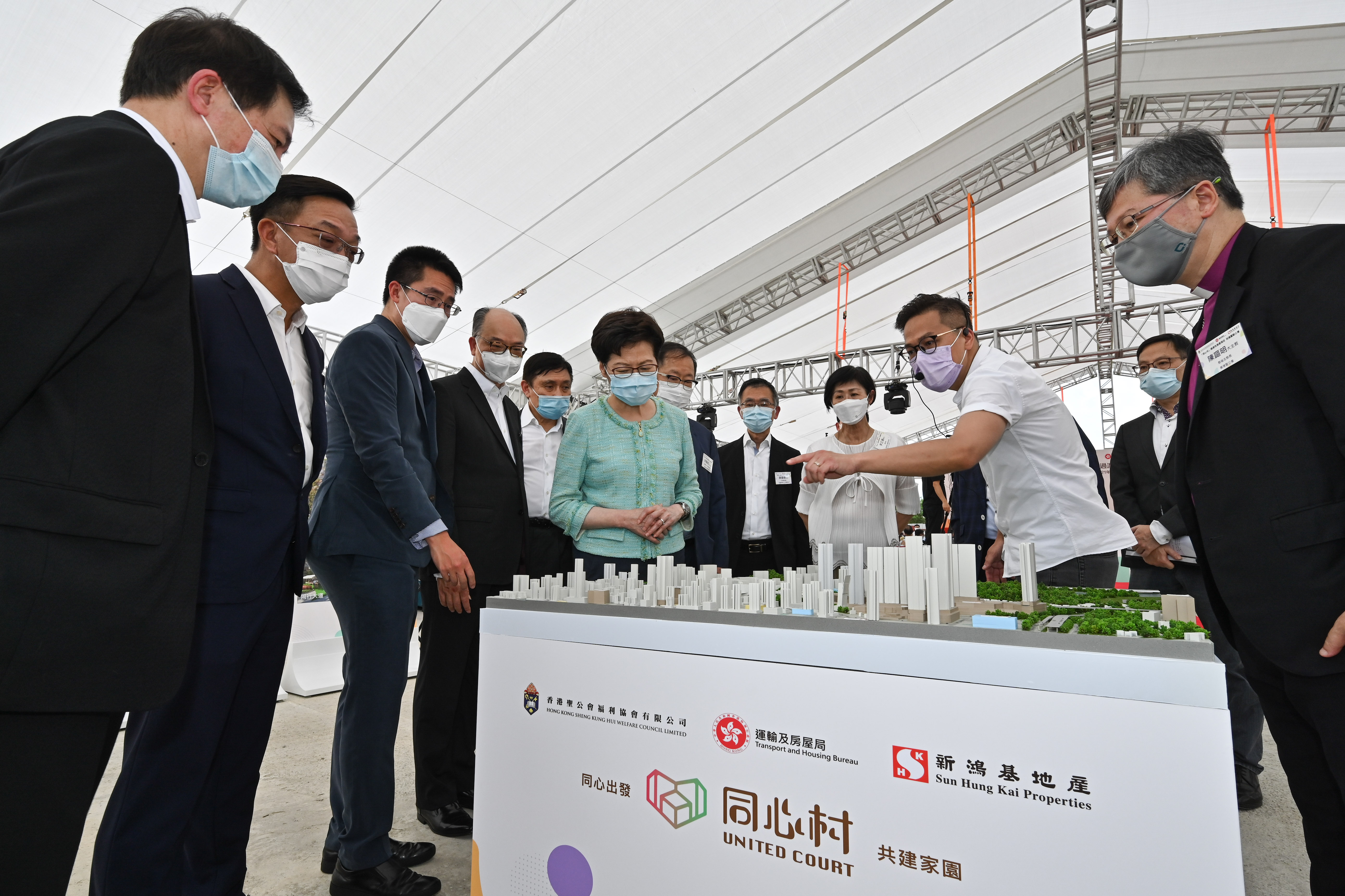 行政長官林鄭月娥今日(六月十六日)下午出席元朗東頭「同心村」過渡性房屋項目祝福暨動土禮。圖示林鄭月娥(左六)聽取香港聖公會福利協會人員透過模型介紹有關項目。