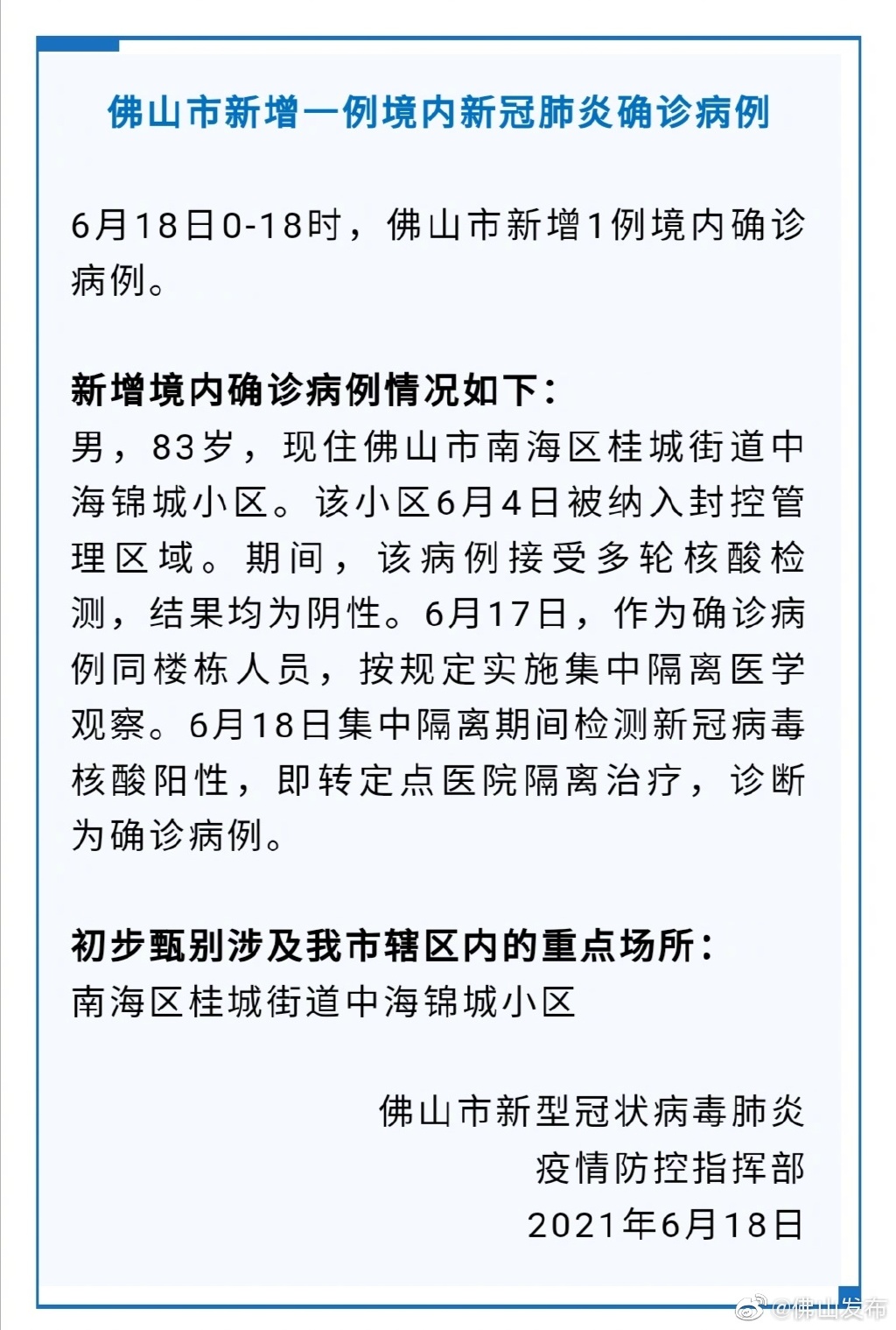 據佛山發布:今天0-18時,佛山市新增1例境內確診病例。情況如下:男,83歲,現住佛山市南海區桂城街道中海錦城小區。該小區6月4日被納入封控管理區域。期間,該病例接受多輪核酸檢測,結果均為陰性。6月17日,作為確診病例同樓棟人員,按規定實施集中隔離醫學觀察。6月18日集中隔離期間檢測新冠病毒核酸陽性,即轉定點醫院隔離治療,診斷為確診病例。初步甄別涉及佛山市轄區內的重點場所:南海區桂城街道中海錦城小區。