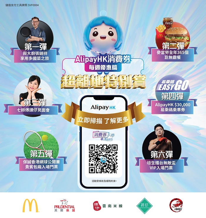 AlipayHK表示,為鼓勵市民領取及使用消費券,將與近百商戶為用戶提供額外5000元獎賞,更推出「超離地特別賞」,為選用AlipayHK接收政府電子消費券用戶提供多項獎品;AlipayHK還會與信和集團合作在奧海城打造「消費劵體驗館」。