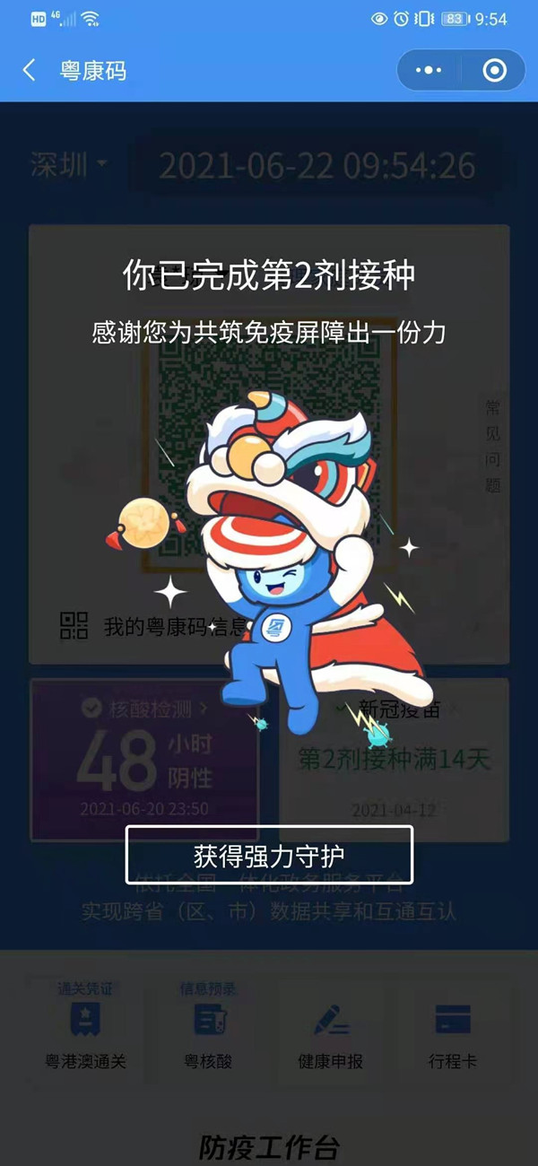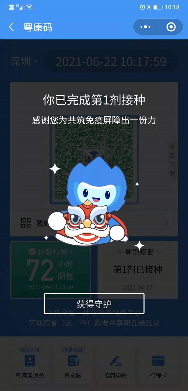 你的「粵康碼」跳出一隻小獅子了嗎?22日早上,接種了新冠疫苗的深圳市民打開「粵康碼」小程序後,驚喜發現多了一個可愛霸氣的小獅子,「粵康碼」四周鑲嵌金邊。