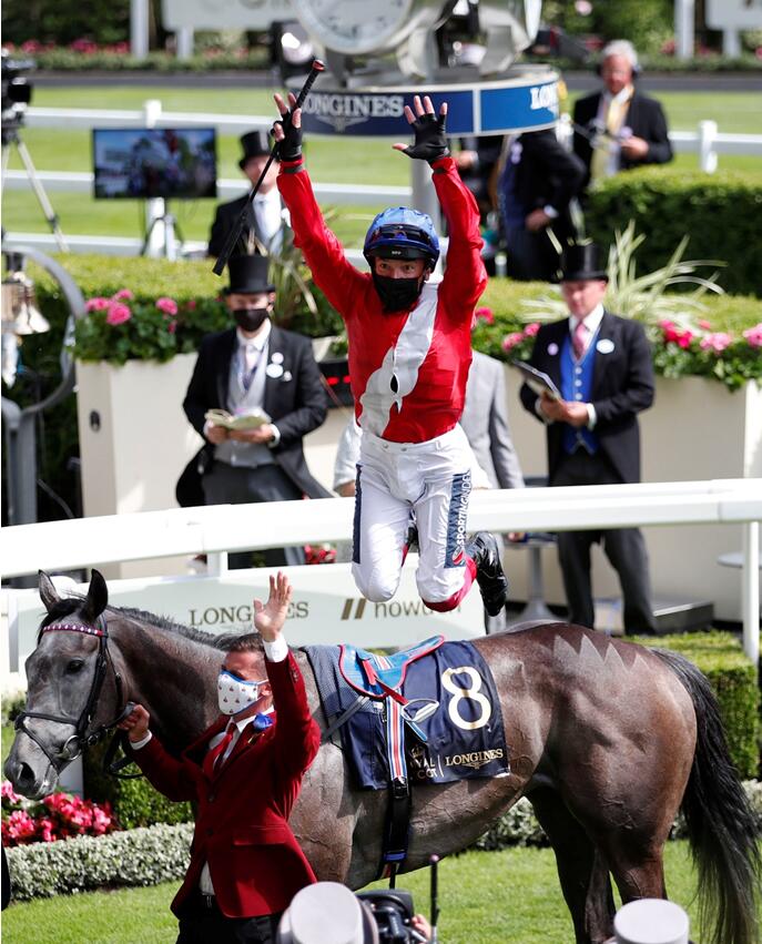 當地時間6月16日,在英國阿斯科特皇家賽馬會,意大利騎師戴圖理高高躍起,慶祝自己的勝利。