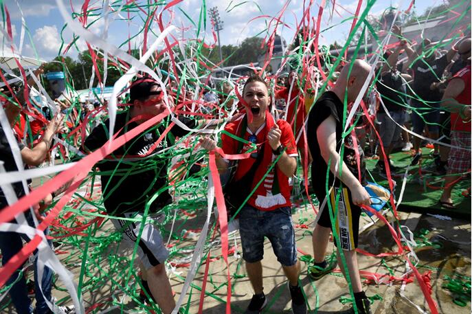 當地時間6月19日,在匈牙利布達佩斯,匈牙利球迷慶祝歐國盃匈牙利對陣法國比賽中的第一個進球。