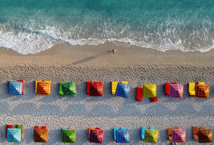 當地時間6月20日,有人在阿爾巴尼亞愛奧尼亞海的海灘上散步。海灘上有五彩斑斕的太陽傘。