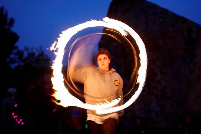 當地時間6月21日,在英國埃夫伯里,人們在慶祝夏至時欣賞日出。還有人晚上用火進行表演。