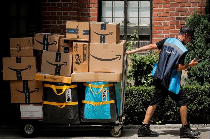 當地時間6月21日,在美國紐約,一名亞馬遜送貨員在其年度「會員日」促銷活動中拉著裝滿包裹的送貨車。