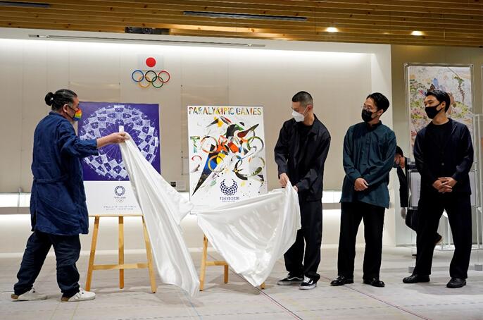 當地時間6月22日,在日本東京,平面設計師們在一個演示活動中揭幕他們的設計的海報,這些海報將用於宣傳東奧和殘奧。