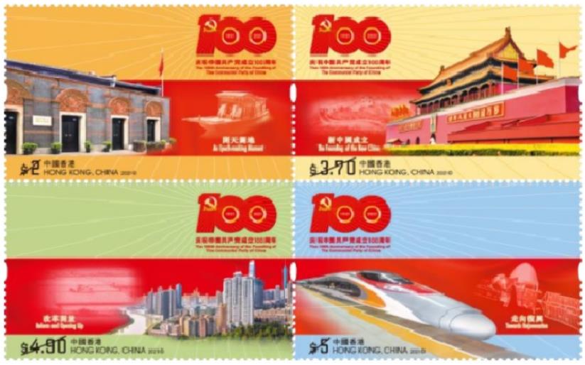中國共產黨於1921年7月成立,為慶祝建黨百年華誕,香港郵政將以此為題,於7月1日發行一套四枚郵票及一張郵票小型張。郵票及郵票小型張引用了中國共產黨成立100周年慶祝活動的唯一官方指定標識,包括圖案及主題名稱引用於郵票設計內,而標識內之56根光芒線寓意中國共產黨奮進之光照耀中華大地。