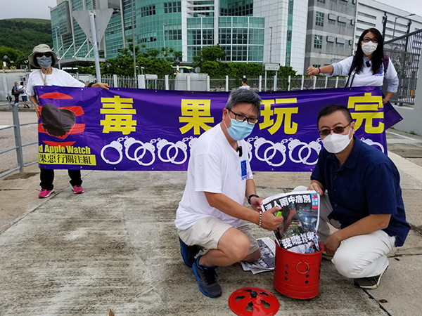 團體「蘋果惡行關注組」今(24日)早到蘋果日報將軍澳總部門前,表示支持保安局根據國安法凍結蘋果日報資金,他們又以「化寶」方式燒毀今日的一份蘋果日報,以示香港社會最終戰勝毒媒體。