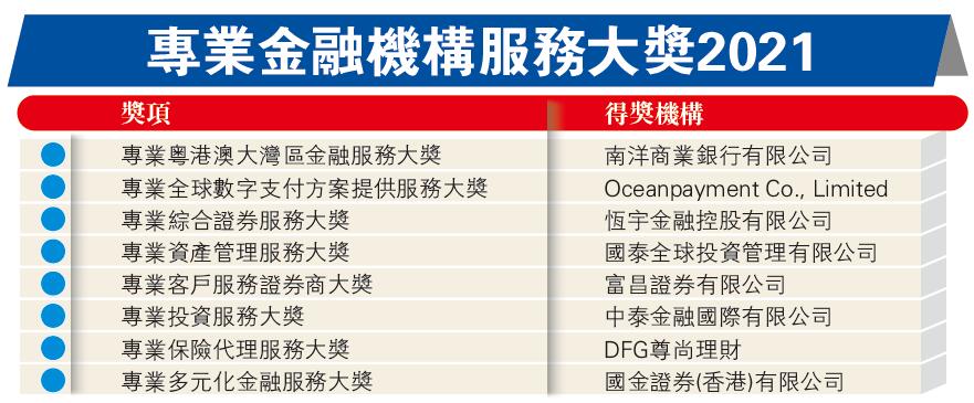 「專業金融機構服務大獎2021」評選結果昨日揭曉,8間來自不同領域的金融機構獲得殊榮。疫情之下,得獎金融機構依然表現卓越,因應市場需求而創新,推出多項嶄新服務滿足市場的理財需要。機構代表在發表得獎感言時表示,今後會繼續保持優質的服務,以客為本,提供多元化的投資產品。獲獎機構同時強調,將積極利用大灣區發展機遇,融入國家發展大局當中。