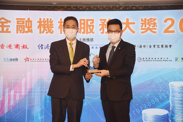 財經事務及庫務局副局長陳浩濂(右)頒獎予恆宇金融控股董事總經理何光宇。