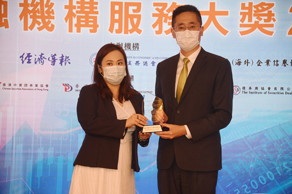 香港經濟導報總編輯顏安生(左)頒獎予中泰金融國際營運總監任艷青。